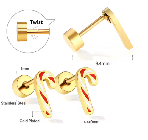 Screw Back Stainless Steel Candy Cane Ear Studs