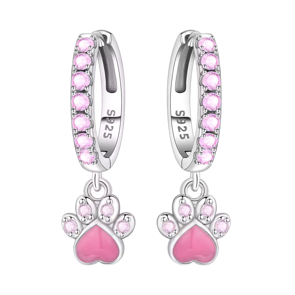 Sterling Silver Pink CZ Paw Print Drop Earrings